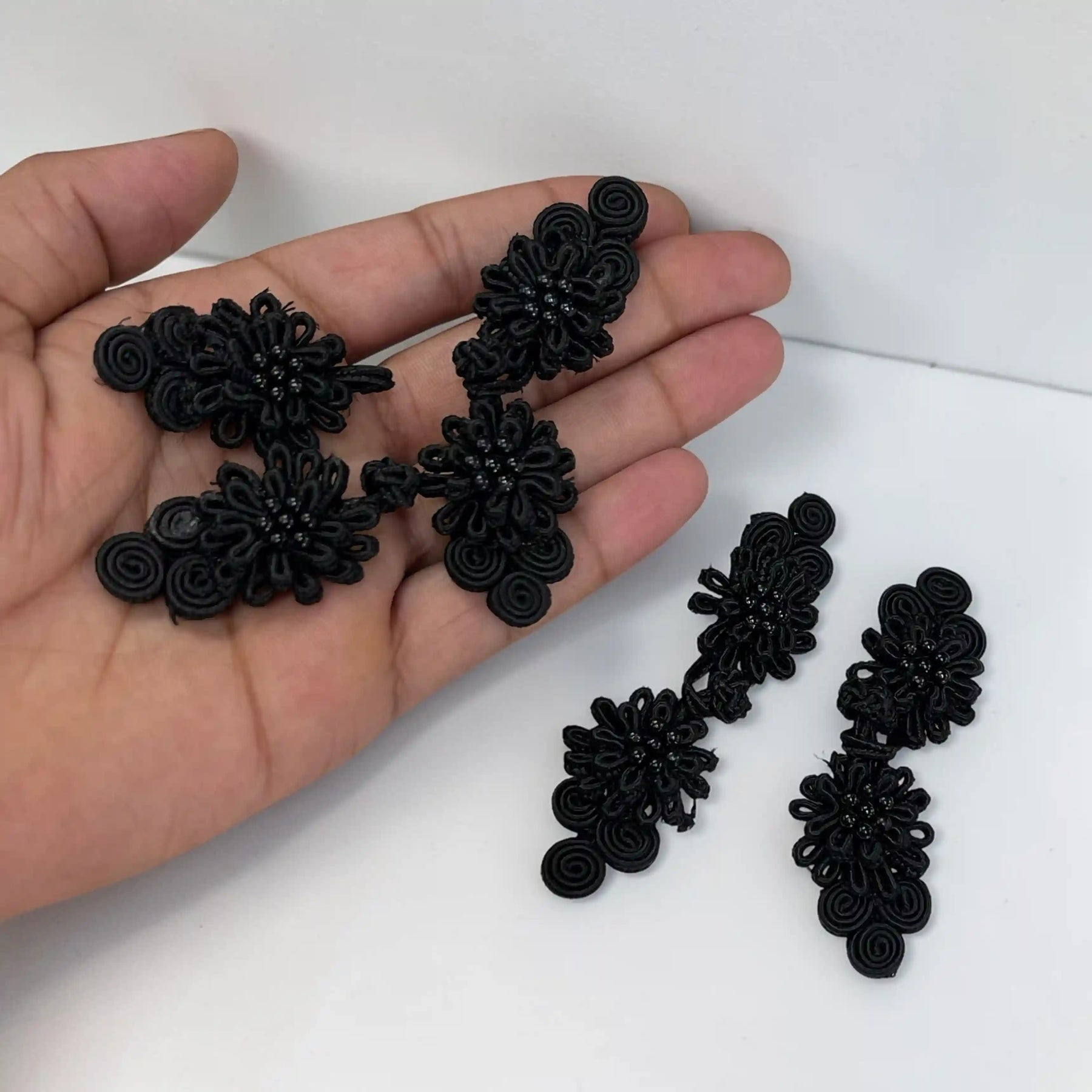 This ornamental closure is easy to sew onto garments and provides a secure fastening while adding a unique decorative element. It is widely used on kurtis, jackets, coats, dresses, cheongsam, qipao, and ethnic wear, as well as in costume design and craft projects. The intricate knot pattern gives a refined handmade appearance that elevates any outfit.
