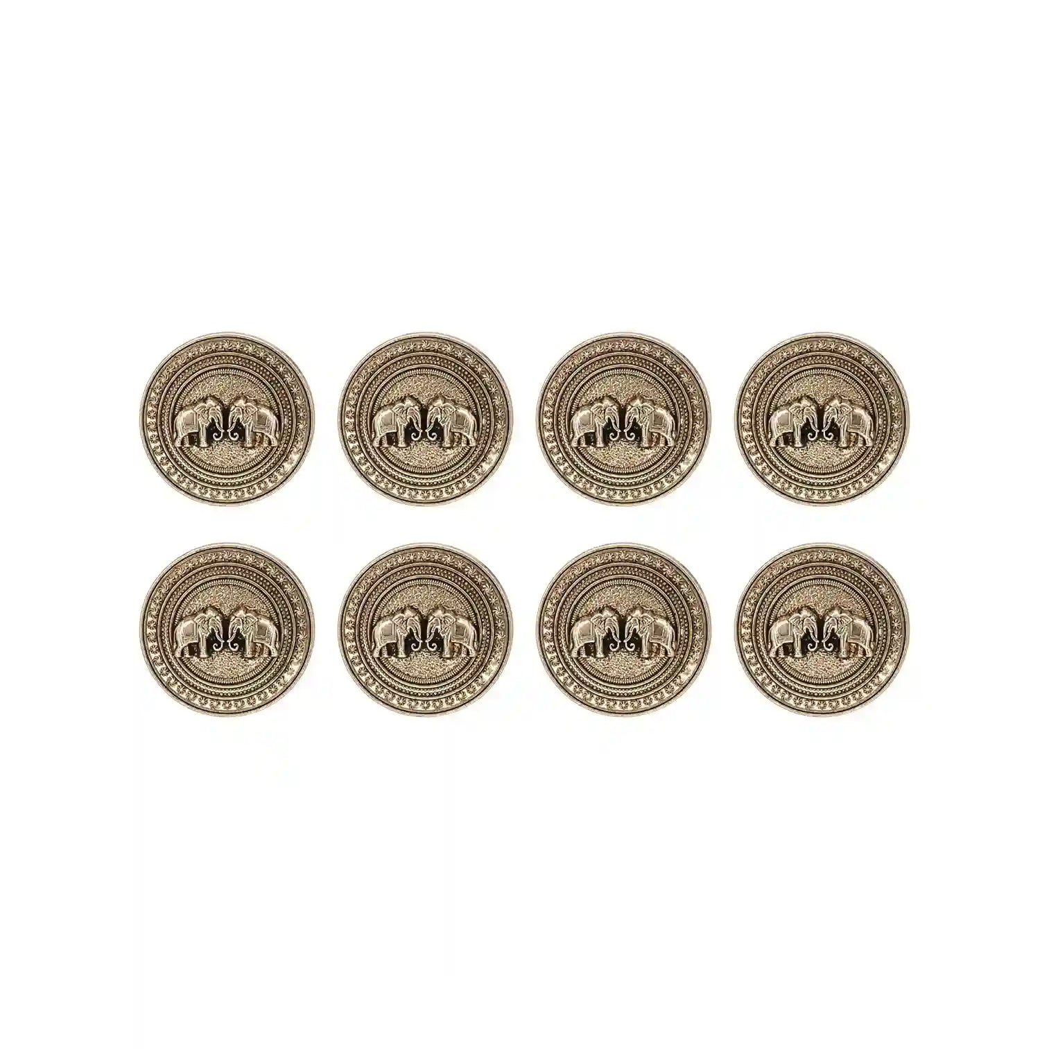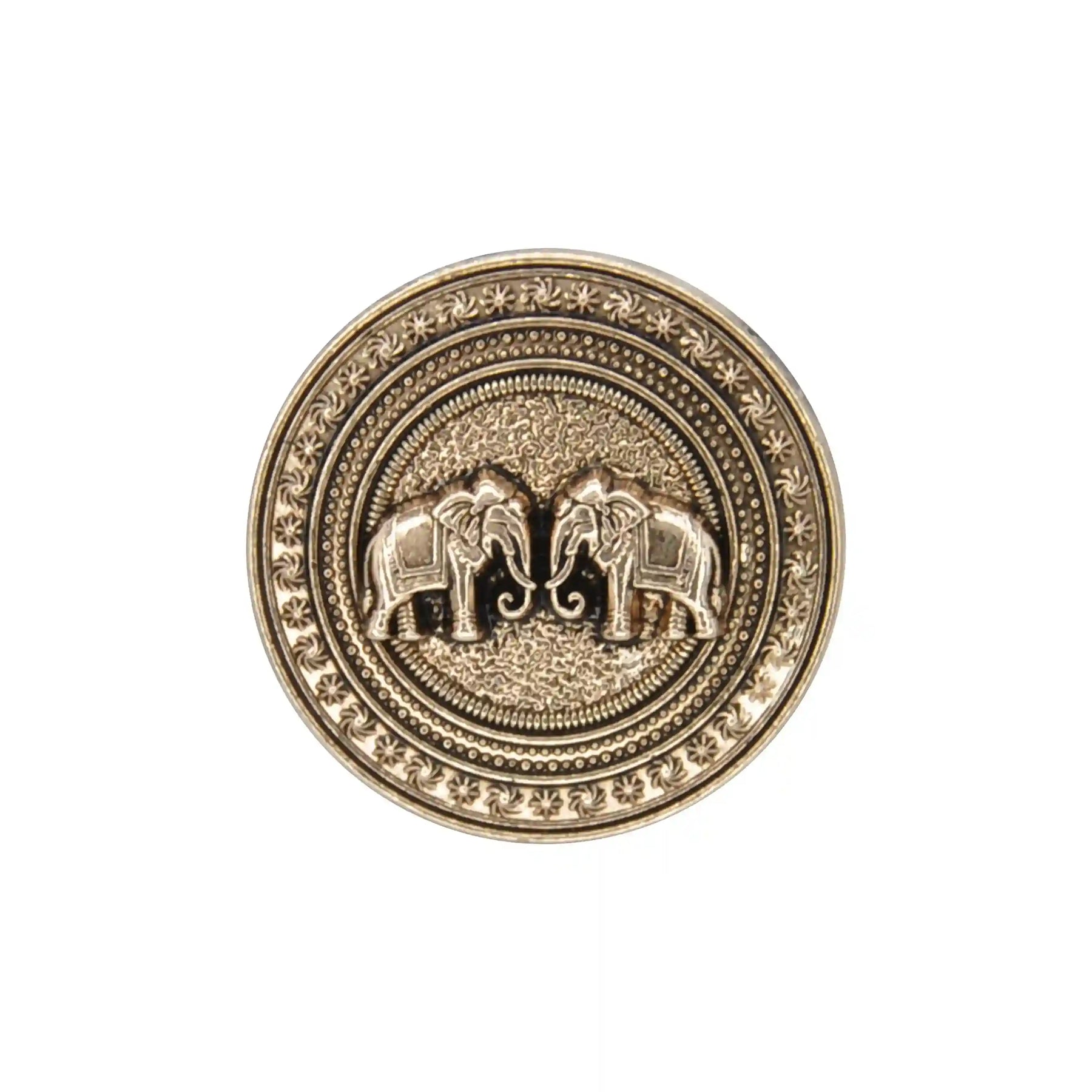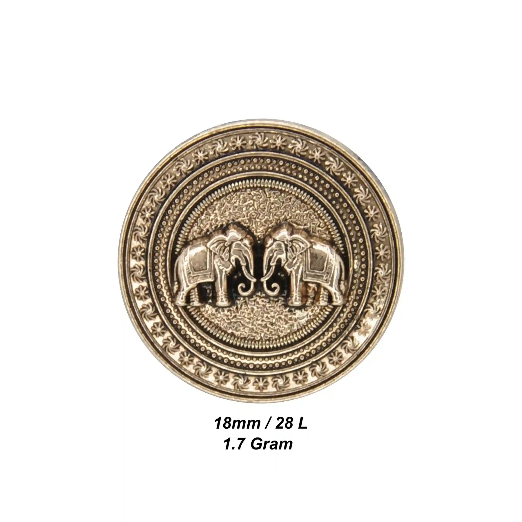 Enhance your garments with Confronted Elephant Design Metal Button, perfect for adding a premium, eye-catching look. These buttons are both stylish and durable, and come in an antique gold color with an edge-to-edge design, crafted from premium, high-quality metal.