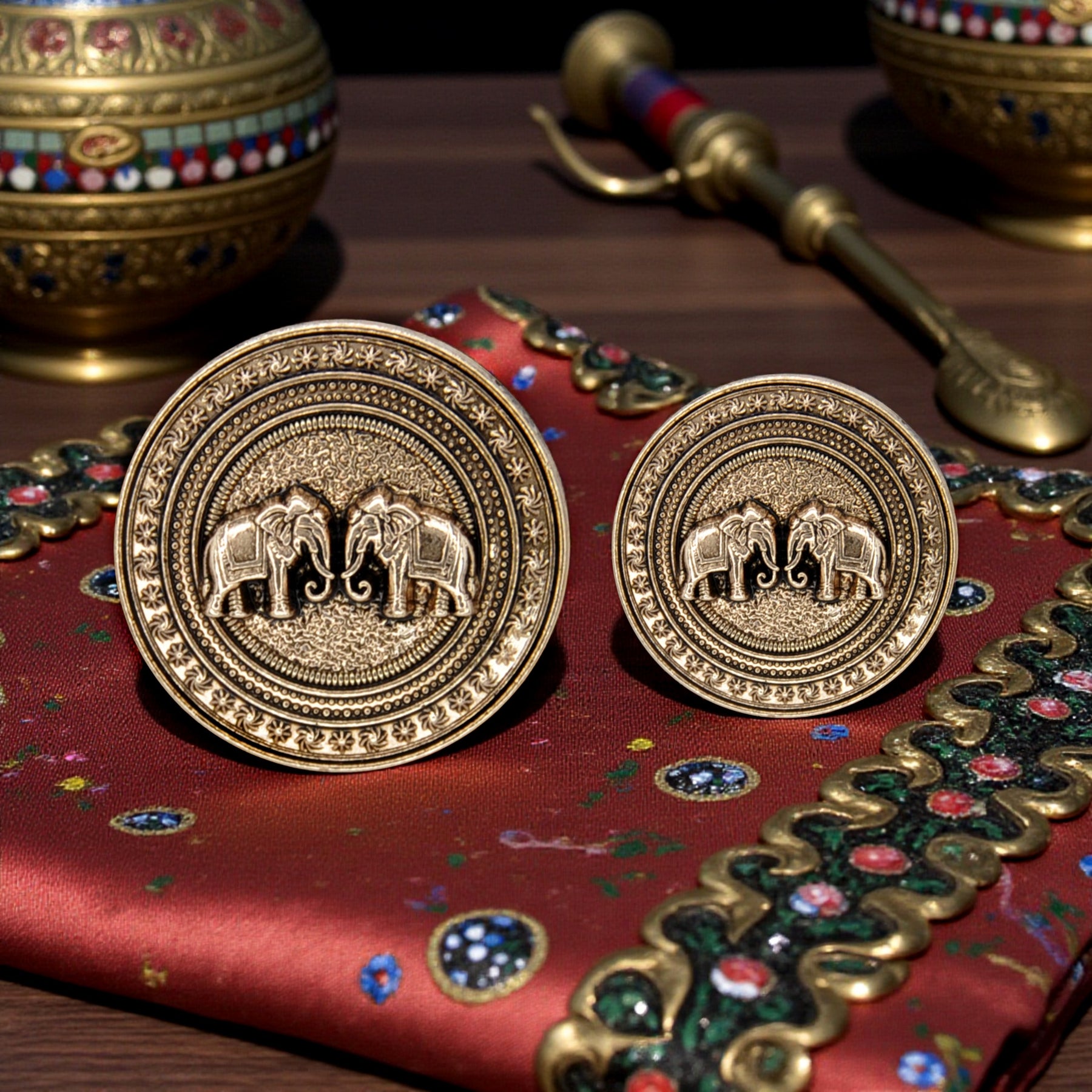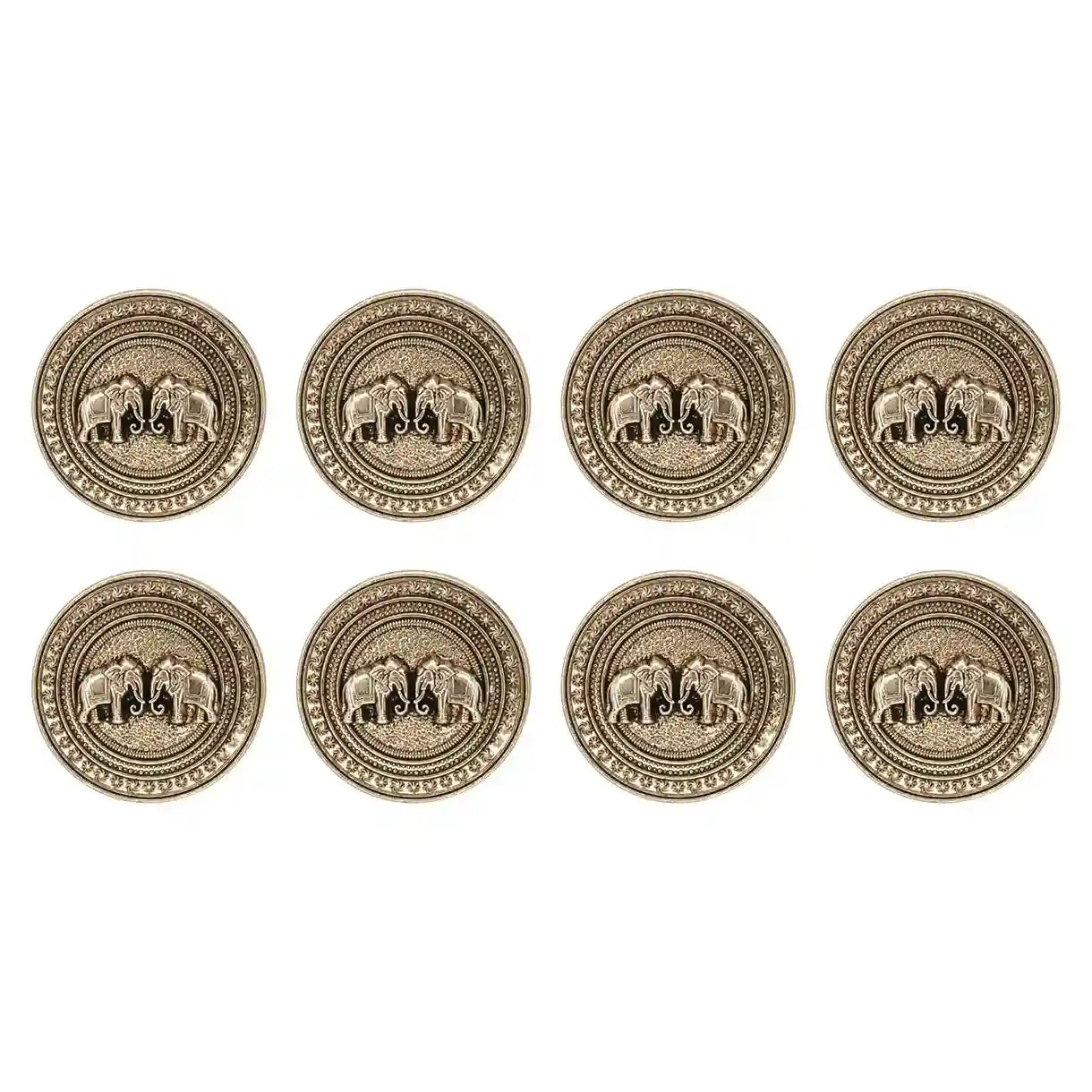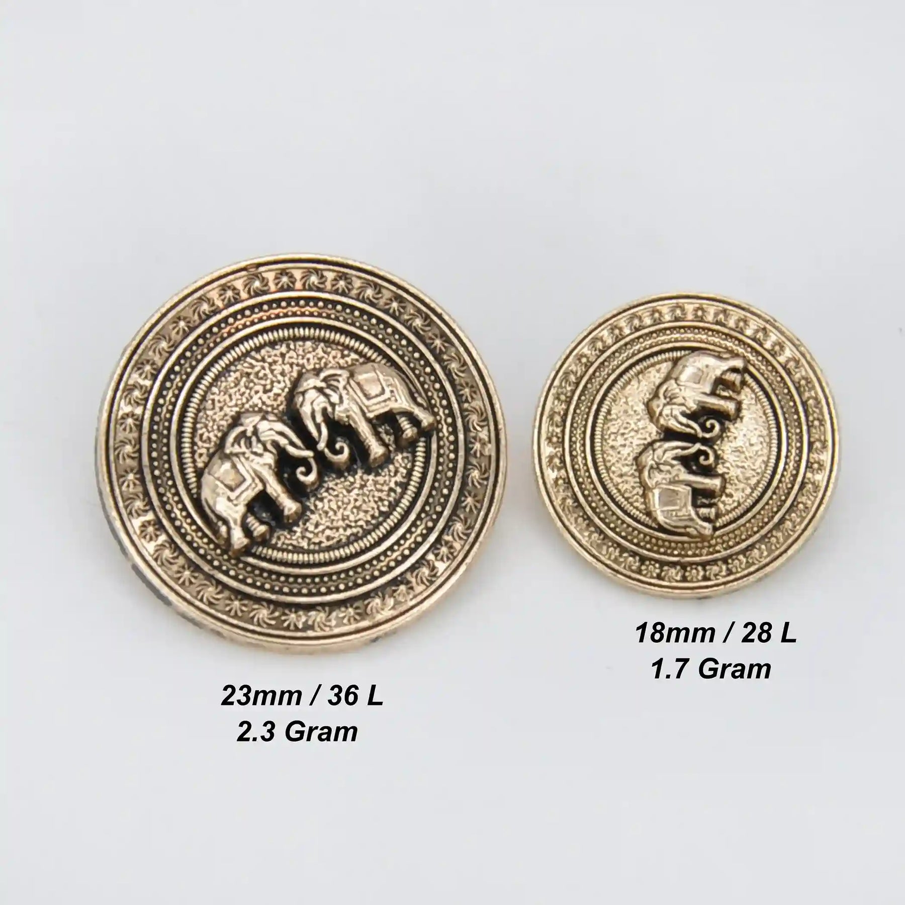 Enhance your garments with Confronted Elephant Design Metal Button, perfect for adding a premium, eye-catching look. These buttons are both stylish and durable, and come in an antique gold color with an edge-to-edge design, crafted from premium, high-quality metal.