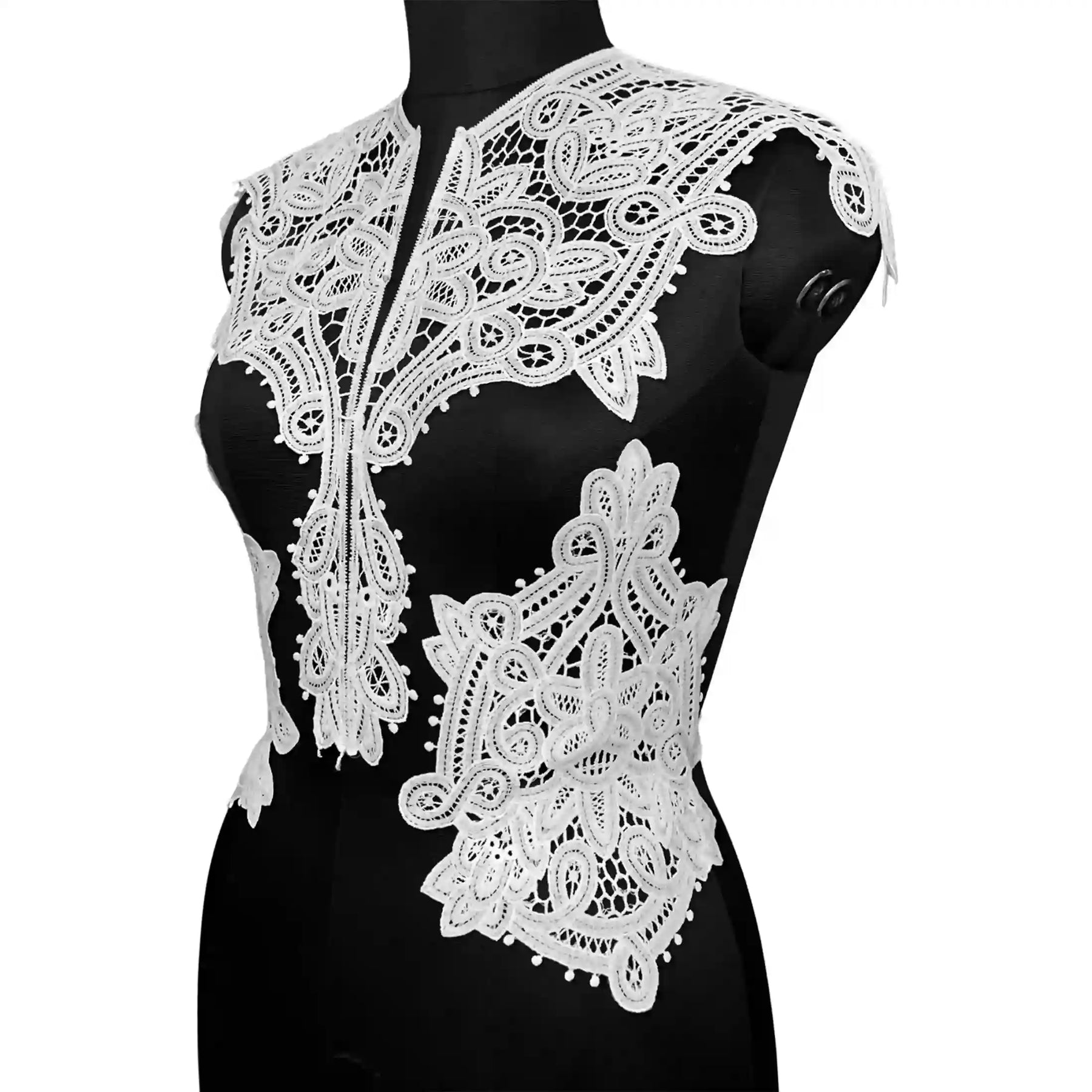 Elevate any garment with this elegant full-body floral lace. Made from premium, skin-friendly material, it features symmetrical panels for a high-fashion look and is ready to sew onto any fabric. Classic white, perfect for dyeing or bridal wear.