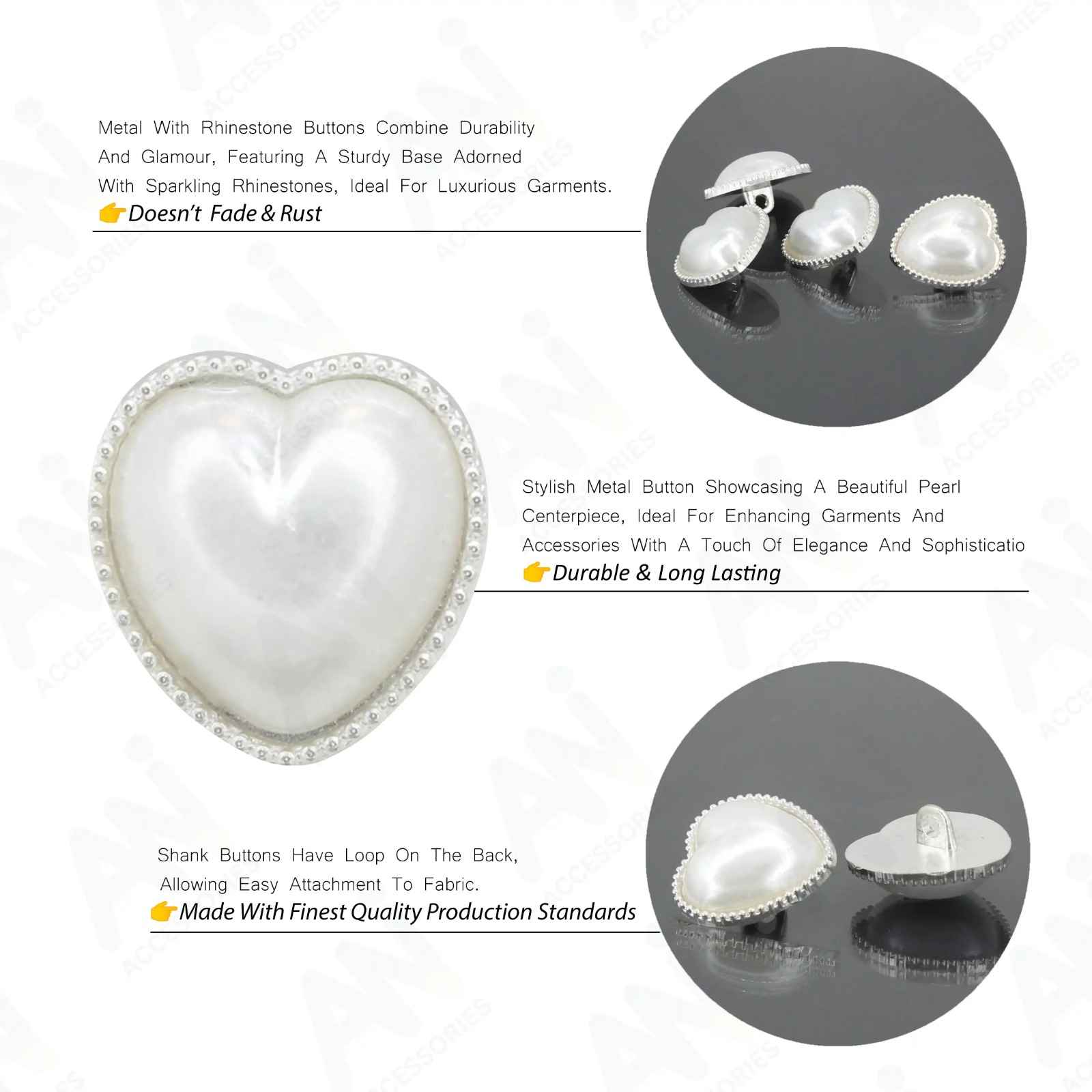 Enhance your garments with Heart Shape Small Rhinestone finish Metal Buttons, perfect for adding a premium, eye-catching look. These buttons are both stylish and durable, and come in silver color with an edge-to-edge design, crafted from premium, high-quality metal.